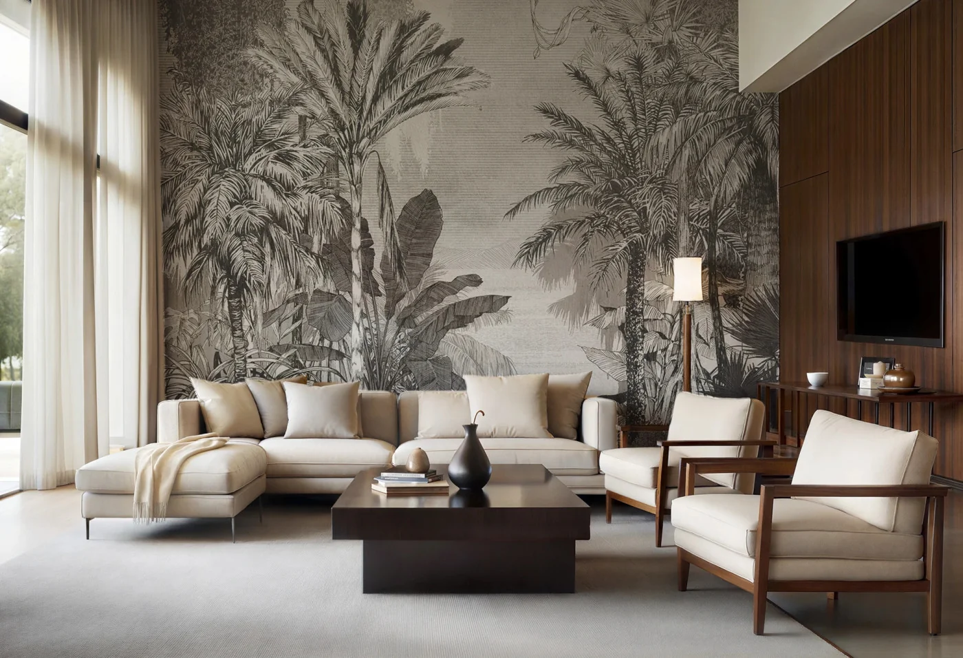 Czarno-biała tapeta do salonu z motywem palm - zanurz się w morzu aranżacyjnych możliwości