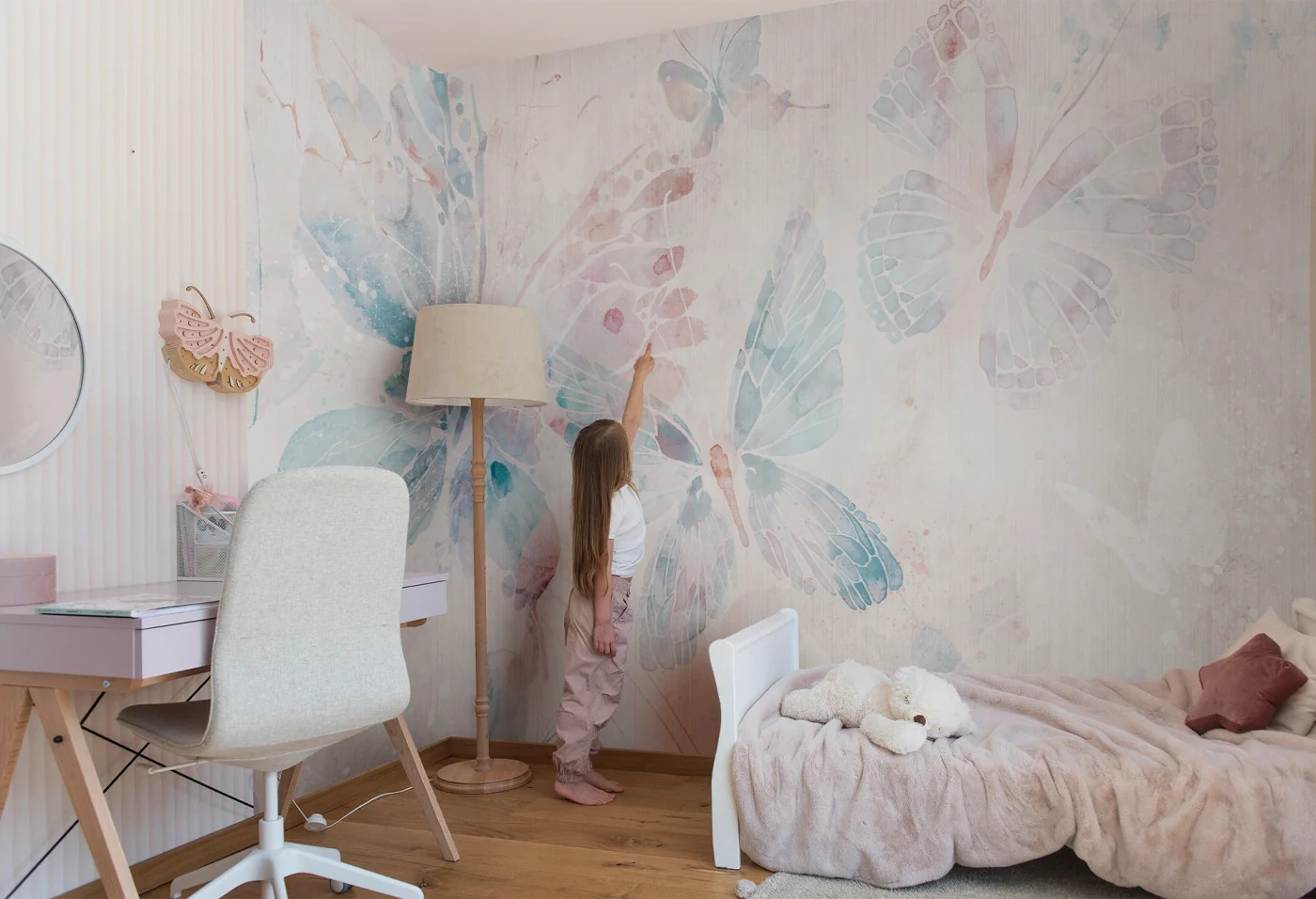 Tapeta dla dzieci MARIPOSA BUBBLEGUM to kunszt nowoczesnego designu. Twoja pociecha dzięki niej może zanurzyć się w różowo-niebieskim morzu motyli. Pastelowa kolorystyka pobudza wyobraźnię, działa kojąco, a przy tym pozwala marzyć. Ponadto znakomicie wpisuje się w nowoczesne trendy aranżacyjne, w których subtelne barwy odgrywają pierwszoplanową rolę.