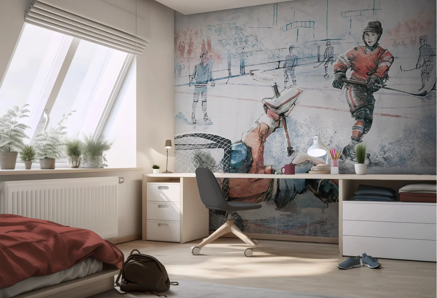 Niebieską tapetę z hokejem w roli głównej możesz aranżować na wiele sposobów. Znakomicie odnajdzie się w towarzystwie innych niebieskich dodatków. Nic jednak nie stoi na przeszkodzie, aby zagrała kontrastem z drewnianymi lub industrialnymi meblami. Nie można odmówić jej nowoczesnego sznytu, który doceni każdy, nawet najbardziej wymagający dorastający chłopiec.